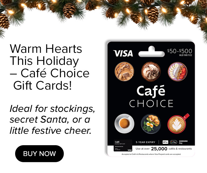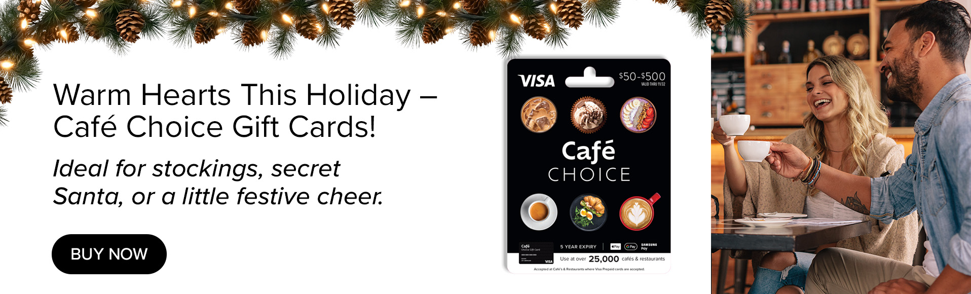 Use the Cafe Choice Gift Card to dine at your favourite cafe’s or restaurant without leaving your home